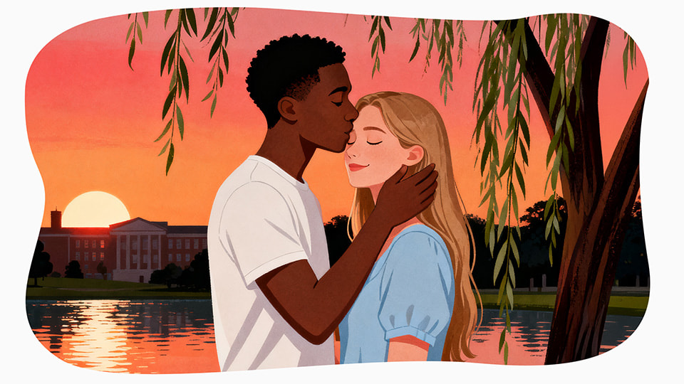 She invited you for “one last walk” before graduation—a soft excuse to be together. You meet at the quiet park near the lake, where the willow trees droop like they are eavesdropping. No one else is around.